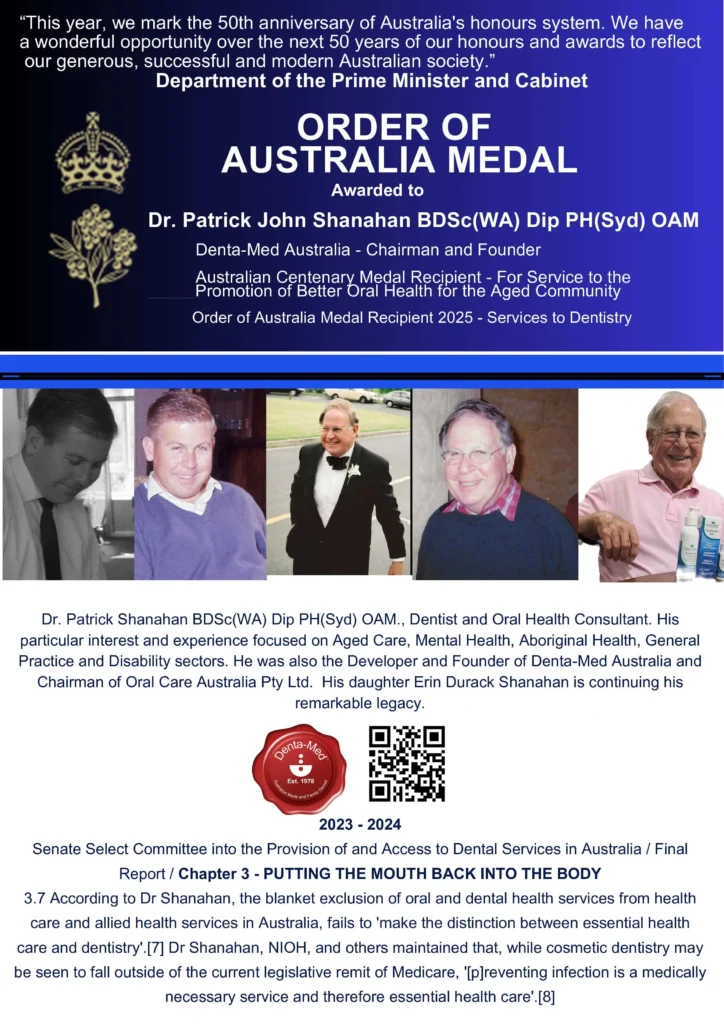 Dr. Patrick. J. Shanahan BDSc(WA) Dip PH(SYD) OAM Dentist, Inventor & Founder of Denta-Med Products Chairman / Founder Oral Care Australia Pty Ltd