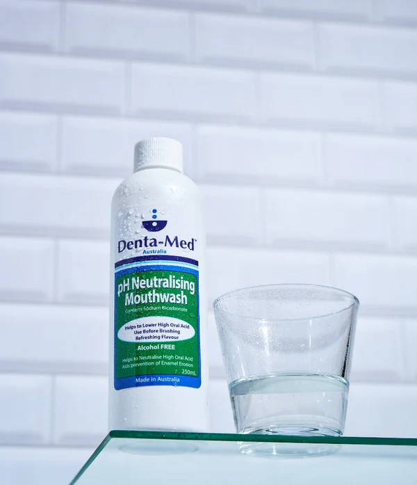 Denta-Med pH Neutralising Mouthwash has a gentle refreshing taste, contains sodium bicarbonate (a well known ingredient to help lower high oral acid levels) and can be used as frequently as required.