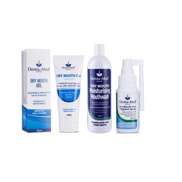 Denta-Med ‘TRY” Bundle consist of Denta-Med Dry Mouth Gel 65mL Tube (boxed), Denta-Med Dry Mouth Oral Hygiene Spray with extended 360 degree nozzle, Denta-Med Moisturising Mouthwash 250mL, enriched with all-natural Malic Acid.